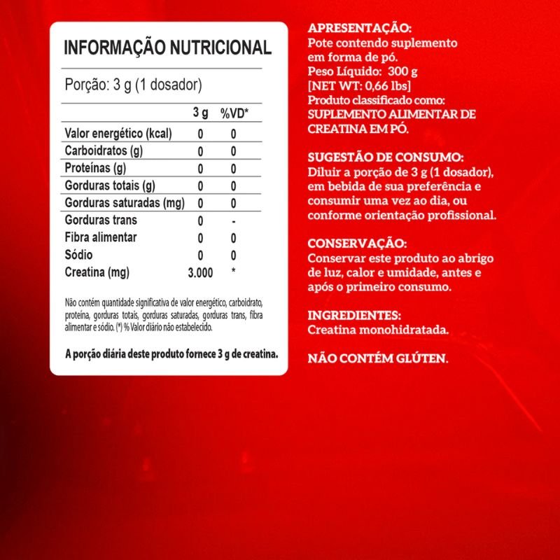Também aparece descrita como creatina 100% pura, livre de aditivos, com foco em máxima absorção e biodisponibilidade. Em páginas de varejo, o produto é associado ainda à melhora da recuperação muscular e redução de fadiga após exercícios pesados.
