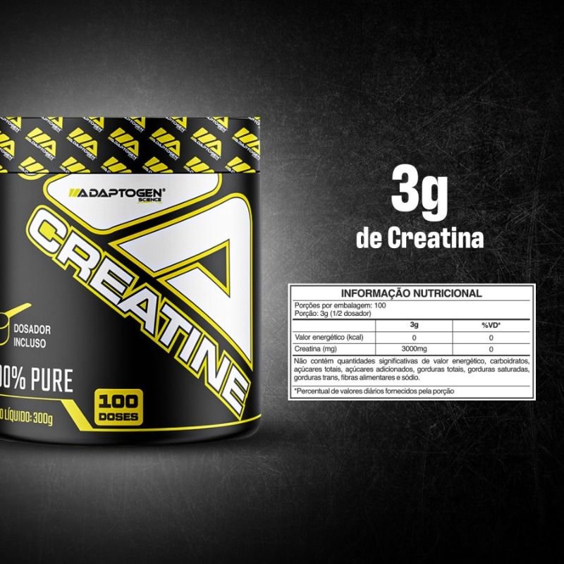 A linha oficial de creatina da Adaptogen também destaca 3g de creatina por dose, além de zero carboidratos, zero açúcar e zero sódio, com foco em pureza e bom custo-benefício. A apresentação de 300g é descrita pela marca como equivalente a 100 doses.